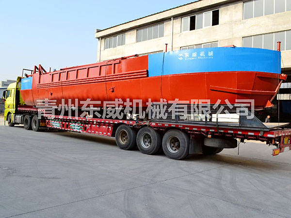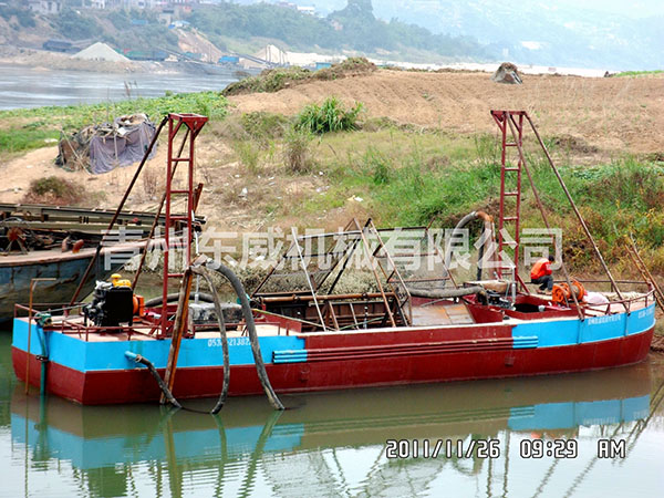 該抽沙設備主要適用于水庫、河道、湖泊等寬車輛不能進入的闊水域作業,工作流程為抽沙運輸船開到抽沙區域,利用抽沙船自帶的抽砂系統將沙子抽進船艙,抽滿船艙后運輸至岸邊,打開底艙門,將沙子卸到水里,再用岸邊的小型抽沙機抽出并輸送至碼頭或者直接用抽砂泵講沙子從船艙輸送至碼頭。該設備結構簡單、工作量大、易損件少,抽出來的沙子含泥量低,無石塊,沙子質量好,是近幾年采沙、清淤比較常用的工具。