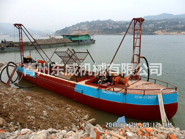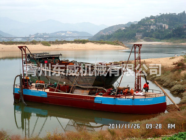 該抽沙設備主要適用于水庫、河道、湖泊等寬車輛不能進入的闊水域作業,工作流程為抽沙運輸船開到抽沙區域,利用抽沙船自帶的抽砂系統將沙子抽進船艙,抽滿船艙后運輸至岸邊,打開底艙門,將沙子卸到水里,再用岸邊的小型抽沙機抽出并輸送至碼頭或者直接用抽砂泵講沙子從船艙輸送至碼頭。該設備結構簡單、工作量大、易損件少,抽出來的沙子含泥量低,無石塊,沙子質量好,是近幾年采沙、清淤比較常用的工具。